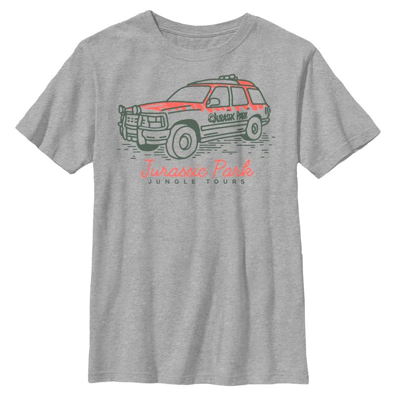 - Strut your stuff with this stylish new boys' graphic t-shirt that is perfect for every occasion! Featuring a sketch-style graphic of a truck with the text: "Jurassic Park Jungle Tours" printed below in themed lettering.