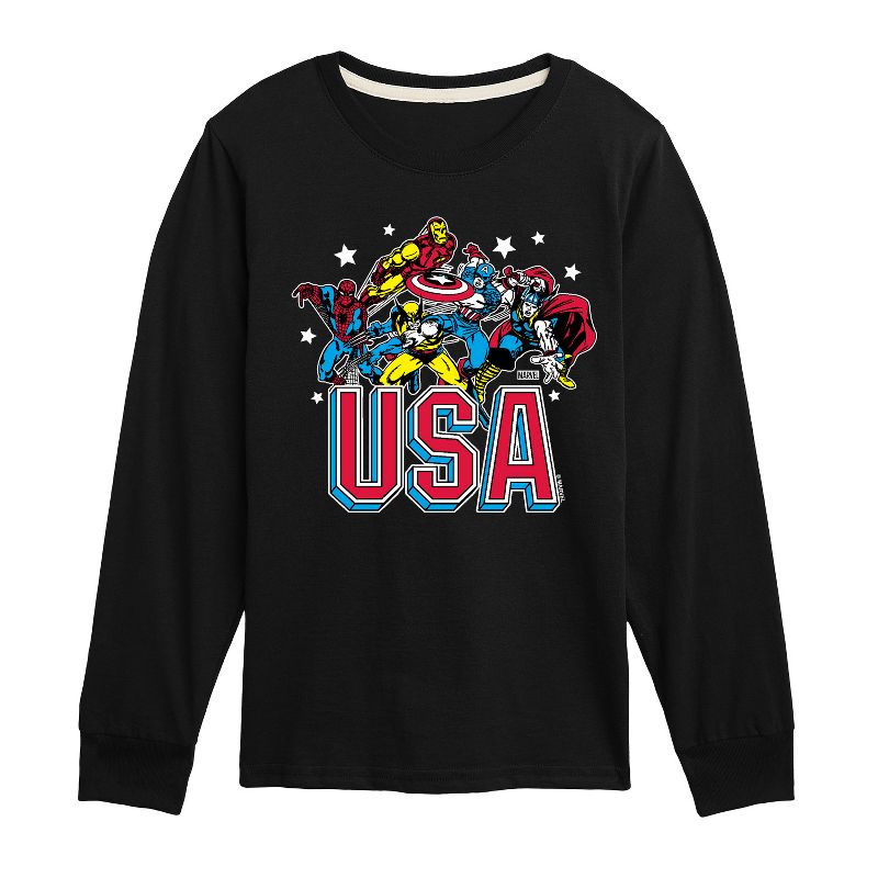 Marvel - USA - Kids Long Sleeve Graphic T-Shirt - Introducing our collection of officially licensed Marvel graphic apparel, where legendary superheroes and iconic moments from the Marvel Universe come to life on high-quality, comfortable clothing. Each design is carefully crafted with vibrant, detailed artwork featuring beloved characters like Spider-Man, Iron Man, Captain America, and the Avengers. From bold graphic tees to stylish hoodies and accessories, our apparel celebrates the thrilling world of Marvel with cutting-edge prints, premium fabrics, and a perfect fit for fans of all ages.