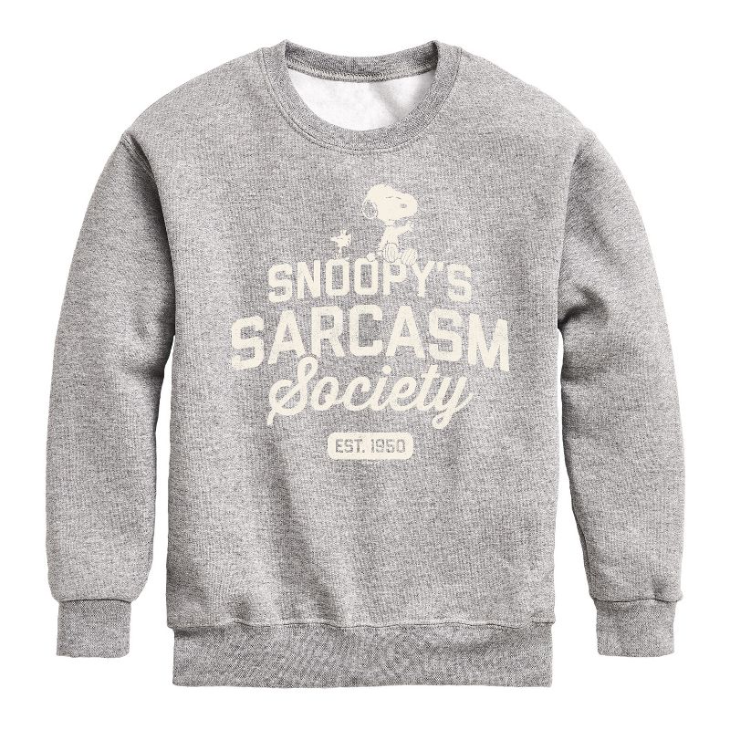 Peanuts - Snoopy Sarcasm Society - Toddler & Youth Crewneck Fleece Sweatshirt - From the best-loved comic strip in history comes officially licensed PEANUTS apparel for fans everywhere. Show your love for Charlie Brown, Snoopy, Woodstock, Lucy, Linus, Pigpen and the whole gang. Copyright Peanuts.