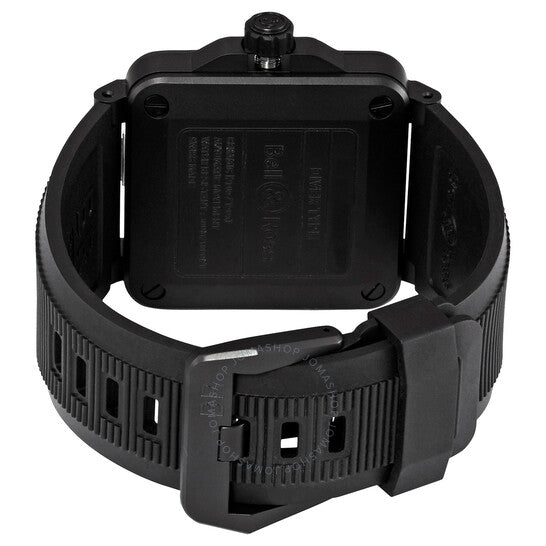 Matt black ceramic case with a black rubber strap. Uni-directional rotating matt black ceramic bezel. Green (lminescent) dial with black hands and index hour markers. Minute markers around the outer rim. Dial Type: Analog. Luminescent hands and markers. Date display between the 4 and 5 o'clock positions. Bell and Ross calibre BR-CAL.302 automatic movement, based upon Sellita SW300-1, containing 25 Jewels, bitting at 28800 vph, and has a power reserve of approximately 38 hours. Scratch resistant sapphire crystal. Screw down crown. Solid case back. Square case shape. Case size: 42 mm. Buckle clasp. Water resistant at 300 meters / 1000 feet. Functions: date, hour, minute, second. Br 03-92 Diver Series. Dive watch style. Watch label: Swiss Made. Bell and Ross BR 03-92 Diver Automatic Men's Watch BR0392-D-C5-CE/SRB.