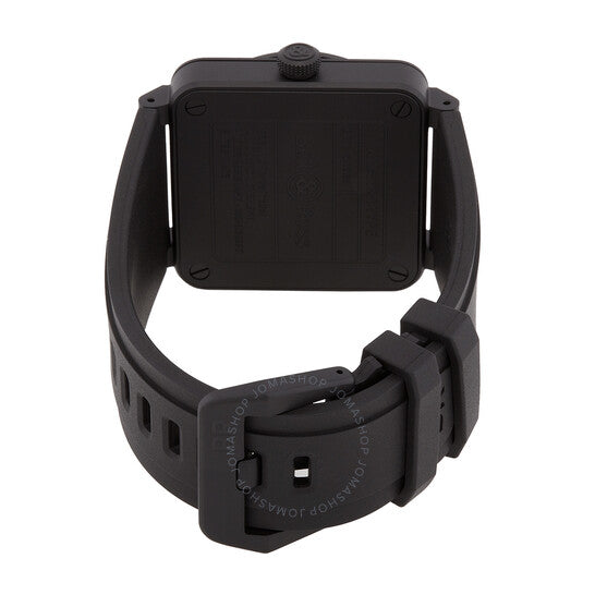 Black ceramic case with a black rubber strap. Fixed black ceramic bezel. Black dial with luminous hands and index-Arabic numeral hour markers. Dial Type: Analog. Luminescent hands and markers. Date display between 4 and 5 o'clock position. Bell and Ross Calibre BR CAL.302 automatic movement with a 54-hour power reserve. Scratch resistant sapphire crystal. Screw down crown. Solid case back. Square case shape, case size: 41 mm, case thickness: 9.65 mm. Tang clasp. Water resistant at 100 meters / 330 feet. Functions: date, hour, minute, second. Br 03 Series. Sport watch style. Watch label: Swiss Made. Bell and Ross BR 03 Automatic Black Dial Men's Watch BR03A-BL-CE/SRB.