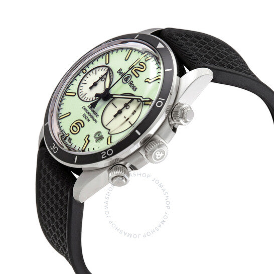 Stainless steel case with a black rubber strap. Fixed stainless steel bezel with a black anodised aluminium ring. Luminescent green painted in super-luminova® dial with bluminous lack hands and index hour markers. Arabic numerals appear at the 6 and 12 o'clock positions. Minute markers around the outer rim. Dial Type: Analog. Luminescent hands and markers. Date display between the 4 and 5 o'clock positions. Chronograph - two sub-dials displaying: 60 second and 30 minute. Bell and Ross Calibre BR-CAL.301 Automatic movement, based upon ETA 2894-2, containing 37 Jewels, bitting at 28800 vph, and has a power reserve of approximately 42 hours. Scratch resistant sapphire crystal. Screw down crown. Transparent case back. Round case shape, case size: 41 mm. Band width: 22 mm. Tang clasp. Water resistant at 100 meters / 330 feet. Functions: chronograph, date, hour, minute, small second. Additional Info: limited edition of 250 pieces. Br V2-94 Series. Luxury watch style. Watch label: Swiss Made. Bell and Ross BR V2-94 Full Lum Chronograph Automatic Men's Watch BRV294-LUM-ST/SRB.