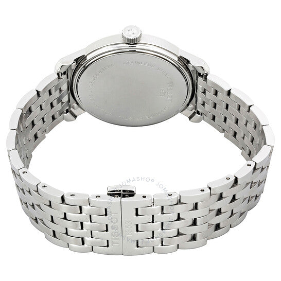 Stainless steel case with a stainless steel bracelet. Fixed stainless steel bezel. Black dial with silver-tone hands and index hour markers. Roman numerals mark the 3, 6, 9 and 12 o'clock positions. Minute markers around an inner ring. Dial Type: Analog. Luminescent hands and markers. Date display at the 3 o'clock position. Quartz movement. Scratch resistant sapphire crystal. Pull / push crown. Solid case back. Case diameter: 40 mm. Case thickness: 8.64 mm. Round case shape. Band width: 20 mm. Deployment clasp with a push button release. Water resistant at 50 meters / 165 feet. Functions: date, hour, minute, second. Casual watch style. Watch label: Swiss Made. Tissot Bridgeport Black Dial Men's Watch T097.410.11.058.00.