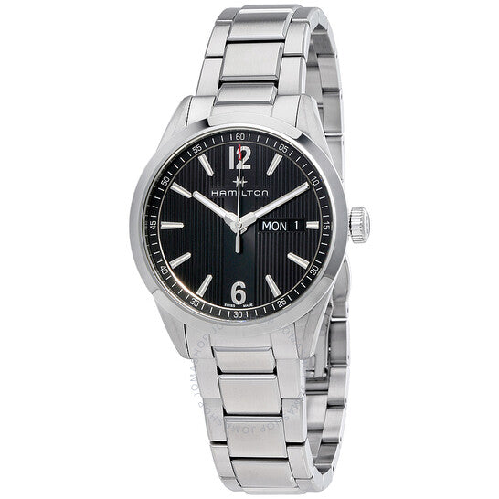 Stainless steel case with a stainless steel bracelet. Fixed stainless steel bezel. Anthracite grey dial with luminous silver-tone hands and index hour markers. Arabic numerals mark the 6 and 12 o'clock positions. Minute markers around the outer rim. Dial Type: Analog. Luminescent hands and markers. Day of the week and date display at the 3 o'clock position. ETA caliber 955.122 quartz movement. Scratch resistant sapphire crystal. Solid case back. Round case shape. Case size: 40 mm. Case thickness: 9 mm. Band width: 18 mm. Fold over clasp with a push button release. Water resistant at 50 meters / 165 feet. Functions: date, day, hour, minute, second. Additional Info: suitable for use around household sinks playing sports and swimming in shallow water but not bathing snorkeling or scuba diving. Casual watch style. Watch label: Swiss Made. Hamilton Broadway Day Date Anthracite Dial Men's Watch H43311135.