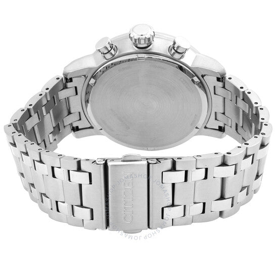 Silver-tone stainless steel case and bracelet. Fixed silver-tone stainless steel bezel with an inlaid green ring. Green dial with silver-tone hands and index hour markers. Minute markers around the outer rim. Dial Type: Analog. Luminescent hands and markers. Date display at the 3 o'clock position. Chronograph - three sub-dials displaying: 60 second, 60 minute and 24 hour. Citizen Caliber Eco-Drive B612 eco-drive movement. Scratch resistant mineral crystal. Solid case back. Round case shape, case size: 44 mm. Band width: 22 mm. Fold over clasp with a safety release. Water resistant at 100 meters / 330 feet. Functions: chronograph, date, hour, minute, second, solar-powered. Brycen Series. Sport watch style. Watch label: Japan Movt. Citizen Brycen Chronograph Eco-Drive Green Dial Men's Watch CA0851-56X.