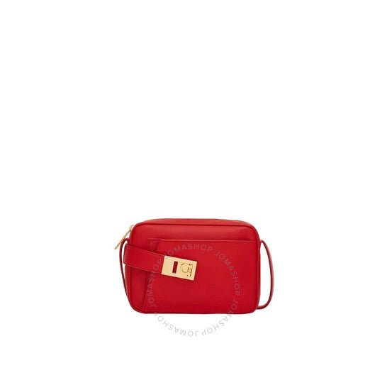 Ferragamo Ladies Crossbody. SKU: 216292 769548. Color: Red. Ferragamo Camera Case Crossbag. This crossbag features a front folding pocket secured by a strap that wraps from the back with a Gancini clasp. The top zip opening reveals a fully organized interior, complemented by tonal piping around the edge. It also includes an adjustable shoulder strap. 100% Calfskin. Made in Italy.