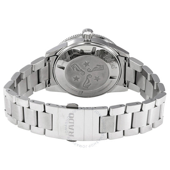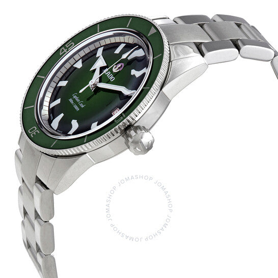 Stainless steel case with a stainless steel bracelet. Uni-directional rotating stainless steel bezel with an inlaid green ceramic ring. Green dial with luminous silver-tone hands and index hour markers. Minute markers around the outer rim. Dial Type: Analog. Luminescent luminous hands. Date display at the 3 o'clock position. Automatic movement with an 80 hour power reserve. Scratch resistant sapphire crystal. Screw down crown. Solid case back. Round case shape. Case size: 42 mm. Case thickness: 12.3 mm. Band width: 20 mm. Fold over clasp with a double push button release. Water resistant at 300 meters. Functions: date, hour, minute, second. Captain Cook Series. Dive watch style. RADO Captain Cook Hrithik Roshan Special Edition Men's Watch R32105319.