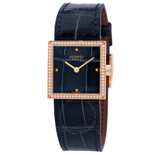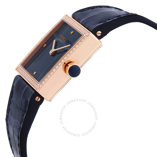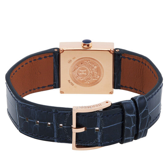 18kt rose gold case with a blue leather strap. Fixed diamond set 18kt rose gold bezel. Blue dial with rose gold-tone hands and index hour markers. Dial Type: Analog. Quartz movement. Scratch resistant sapphire crystal. Pull / push crown. Solid case back. Square case shape, case size: 24 x 24 mm. Buckle clasp. Water resistant at 30 meters / 100 feet. Functions: hour, minute. Carre Cuir Series. Luxury watch style. Watch label: Swiss Made. Hermes Carre Cuir Quartz Diamond Blue Dial Ladies Watch 045034WW00.