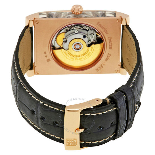 Rose gold-tone case with a black leather strap. Fixed rose gold-tone bezel. White dial with rose gold-tone hands and Roman numeral hour markers. Minute markers around the inner ring. Dial Type: Analog. Date display at the 6 o'clock position. Automatic movement. Scratch resistant sapphire crystal. Transparent case back. Case size: 39 mm x 33 mm. Rectangle case shape. Tang clasp. Water resistant at 30 meters / 100 feet. Functions: date, hour, minute, second. Dress watch style. Watch label: Swiss Made. Item Variations: FC 303V4C29, FC.303V4C29, FC303V4C29. Frederique Constant Carree White Dial Automatic Men's Watch FC-303V4C29.
