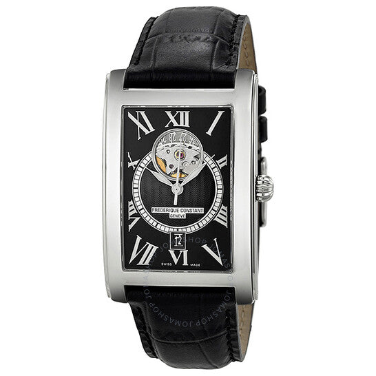 Stainless steel case with a black leather strap. Fixed stainless steel bezel. Black dial (with heart beat display) with silver-tone hands and Roman numeral hour markers. Minute markers around the outer rim. Dial Type: Analog. Date display at the 6 o'clock position. Automatic movement. Scratch resistant sapphire crystal. Solid case back. Case dimensions: 47 mm x 30.7 mm. Case thickness: 10.2 mm. Rectangle case shape. Tang clasp. Water resistant at 30 meters / 100 feet. Functions: date, hour, minute, second. Dress watch style. Frederique Constant Carree Black Dial Automatic Men's Watch FC-315BS4C26.