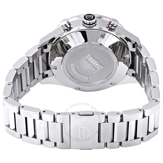 Stainless steel case with a stainless steel bracelet. Fixed stainless steel bezel with a blue ceramic ring showing tachymeter markings. Blue opalin dial with luminous silver-tone hands and index hour markers. Minute markers around the outer rim. Dial Type: Analog. Luminescent hands and markers. Date display at the 3 o'clock position. Chronograph - three white sub-dials displaying: 60 second, 30 minute and 12 hour. TAG Heuer calibre 16 automatic movement, based upon Valjoux 7750, containing 25 Jewels, bitting at 28800 vph, and has a power reserve of approximately 42 hours. Scratch resistant sapphire crystal. Pull / push crown. Solid case back. Round case shape. Case size: 41 mm. Band width: 20 mm. Fold over clasp with a push button release. Water resistant at 100 meters / 330 feet. Functions: chronograph, date, hour, minute, second. Carrera Series. Casual watch style. Watch label: Swiss Made. Tag Heuer Carrera Automatic Chronograph Blue Dial Men's Watch CV201AR.BA0715.