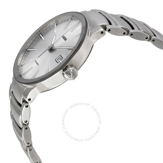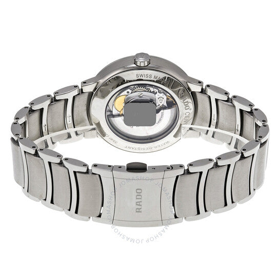 Stainless steel case with a stainless steel bracelet. Fixed stainless steel bezel. Grey dial with luminous silver-tone hands and stick hour markers. The Rado name appears below the 12 o'clock position. Minute markers around the outer rim. Dial Type: Analog. Luminescent hands and markers. Date display at the 3 o'clock position. Automatic movement with a 38-hour power reserve. Scratch resistant sapphire crystal. Textured steel crown. Skeleton case back. Case dimensions: 38 mm x 42 mm. Case thickness: 11 mm. Round case shape. Band width: 16.3 mm. Deployment clasp. Water resistant at 30 meters / 100 feet. Functions: date, hour, minute, second. Casual watch style. Rado Centrix Automatic Stainless Steel Men's Watch R30939103.