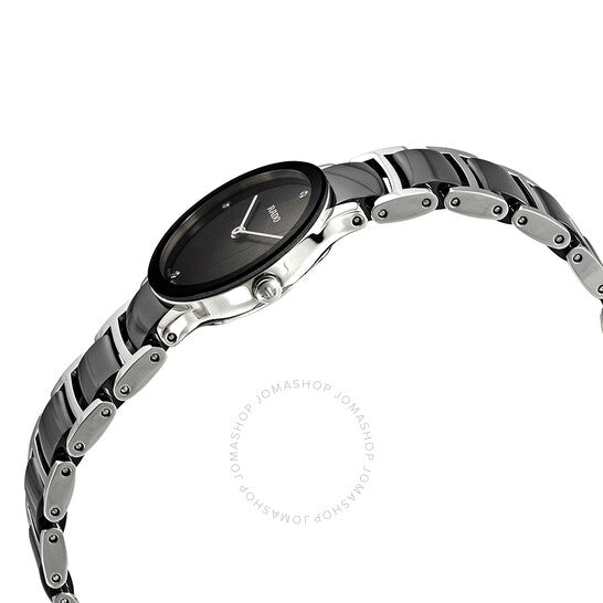 Stainless steel case with a stainless steel bracelet with black (high-tech) ceramic inserts. Fixed black bezel. Black dial with silver-tone hands. Diamonds set at the 3, 6, 9 and 12 o'clock positions. Dial Type: Analog. Quartz movement. Scratch resistant sapphire crystal. Pull / push crown. Solid case back. Round case shape. Case size: 23 mm. Case thickness: 6.1 mm. Fold over clasp with a push button release. Water resistant at 30 meters / 100 feet. Functions: hour, minute. Centrix Series. Dress watch style. Watch label: Swiss Made. Rado Centrix Black Dial Steel and Ceramic Ladies Watch R30191712.