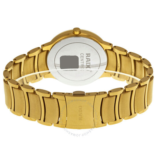 Yellow gold PVD stainless steel case and bracelet. Fixed yellow gold PVD bezel. Black dial with yellow gold-tone hands. Diamonds mark the 3, 6, 9 and 12 o'clock positions. Dial Type: Analog. Date display at the 3 o'clock position. Rado calibre 115 quartz movement. Scratch resistant sapphire crystal. Pull / push crown. Solid case back. Case size: 38 mm. Case thickness: 7.3 mm. Round case shape. Band width: 20 mm. Deployment clasp with a push button release. Water resistant at 30 meters / 100 feet. Functions: date, hour, minute, second. Dress watch style. Watch label: Swiss Made. Rado Centrix Jubile Black Dial Men's Watch R30527713.