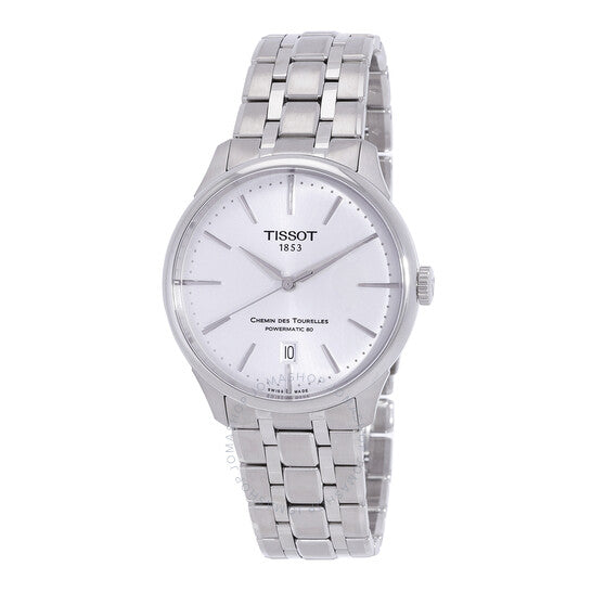 Silver-tone stainless steel case and bracelet. Fixed silver-tone stainless steel bezel. Silver dial with silver-tone hands and index hour markers. Minute markers around the outer rim. Dial Type: Analog. Date display at the 6 o'clock position. Powermatic 80.111 Automatic movement, containing 23 Jewels, bitting at 28800 vph, and has a power reserve of approximately 80 hours. Scratch resistant sapphire crystal. Pull / push crown. Transparent case back. Round case shape, case size: 39 mm, case thickness: 11.2 mm. Band width: 20 mm. Butterfly clasp. Water resistant at 50 meters / 165 feet. Functions: date, hour, minute, second. Chemin Des Tourelles Series. Casual watch style. Watch label: Swiss Made. Tissot Chemin Des Tourelles Automatic Silver Dial Men's Watch T139.807.11.031.00.
