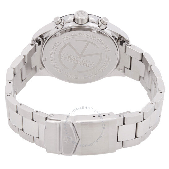 Silver-tone stainless steel case and bracelet. Fixed black stainless steel bezel. Black dial with silver-tone hands and index hour markers. Minute markers around the outer rim. Dial Type: Analog. Luminescent hands and markers. Date display at the 4 o'clock position. Chronograph - three sub-dials displaying: 60 second, 30 minute and 12 hour. Ronda Caliber 5030.D quartz movement. Scratch resistant sapphire crystal. Pull / push crown. Solid case back. Round case shape, case size: 42 mm. Fold over clasp. Water resistant at 100 meters / 330 feet. Functions: chronograph, date, hour, minute, small second. Chrono II Series. Casual watch style. Watch label: Swiss Made. Mathey-Tissot Chrono II Chronograph Quartz Black Dial Men's Watch H938CHAN.