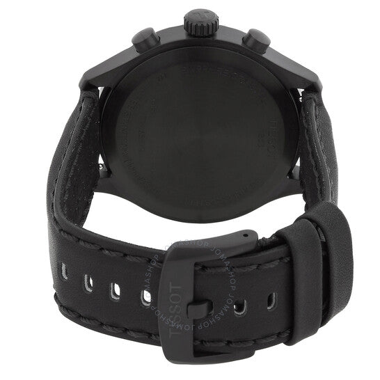 Black PVD stainless steel case with a black leather strap. Fixed black PVD stainless steel bezel. Black dial with black hands and Arabic numeral hour markers. Arabic numeral minute markers (at 5 minute intervals). Dial Type: Analog. Chronograph - three sub-dials displaying: 60 second, 30 minute and 1/10th of a second. ETA Caliber G10.212 quartz movement. Scratch resistant sapphire crystal. Solid case back. Round case shape, case size: 45 mm, case thickness: 11 mm. Band width: 22 mm. Tang clasp. Water resistant at 100 meters / 330 feet. Functions: chronograph, rattrapante, date, hour, minute, small second. Chrono Xl Series. Sport watch style. Watch label: Swiss Made. Tissot Chrono XL Chronograph Quartz Black Dial Men's Watch T116.617.36.052.00.