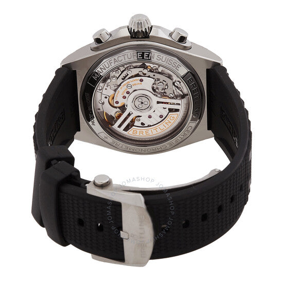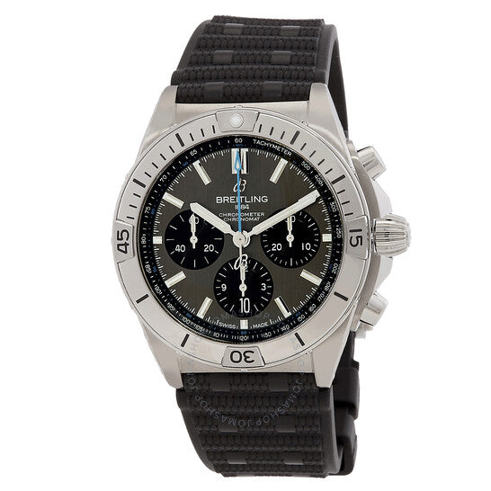 Silver-tone titanium case with a black rubber strap. Silver-tone titanium bezel. Slate dial with silver-tone hands and index hour markers. Minute markers around the outer rim. Dial Type: Analog. Luminescent hands and markers. Chronograph - three sub-dials displaying: 60 second, 30 minute and 1/10th of a second. Breitling Calibre 01 Automatic movement, containing 47 Jewels, composed of 346 parts, bitting at 28800 vph, and has a power reserve of approximately 70 hours. Scratch resistant sapphire crystal. Screw down crown. Transparent see through case back. Round case shape, case size: 42 mm, case thickness: 15.1 mm. Band width: 22 mm. Folding clasp. Water resistant at 200 meters / 660 feet. Functions: chronograph, hour, minute, second. Sport watch style. Watch label: Swiss Made. Breitling Chronograph Automatic Men's Watch EB0134101M1S1.