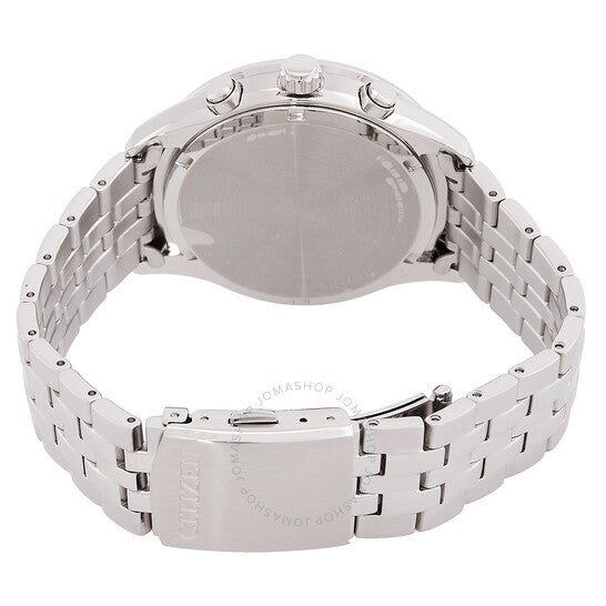 Silver-tone stainless steel case and bracelet. Fixed silver-tone stainless steel bezel. Blue dial with silver-tone hands and index hour markers. Minute markers around the outer rim. Dial Type: Analog. Date display at the 4 o'clock position. Chronograph - three sub-dials displaying: 60 second, 60 minute and 24 hour. Citizen Caliber Eco-Drive H504 eco-drive movement. Scratch resistant sapphire crystal. Solid case back. Round case shape, case size: 42 mm. Fold over clasp with a safety release. Water resistant at 100 meters / 330 feet. Functions: chronograph, date, hour, minute, second, solar-powered. Sport watch style. Watch label: Japan Movt. Citizen Chronograph Eco-Drive Blue Dial Men's Watch AT2570-56L.