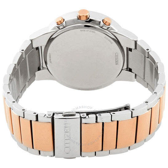 Silver-tone stainless steel case with a two-tone (silver-tone and rose gold ip) stainless steel bracelet. Fixed silver-tone stainless steel bezel. Green dial with rose gold-tone hands and index hour markers. Minute markers around the outer rim. Dial Type: Analog. Date display at the 4 o'clock position. Chronograph - three sub-dials displaying: 60 second, 60 minute and 24 hour. Citizen Caliber Eco-Drive H504 eco-drive movement. Scratch resistant mineral crystal. Pull / push crown. Solid case back. Round case shape, case size: 43 mm, case thickness: 10.1 mm. Fold over clasp with a safety release. Water resistant at 30 meters / 100 feet. Functions: chronograph, date, hour, minute, second, solar-powered. Sport watch style. Watch label: Japan Movt. Citizen Chronograph Eco-Drive Green Dial Men's Watch AT2244-84X.
