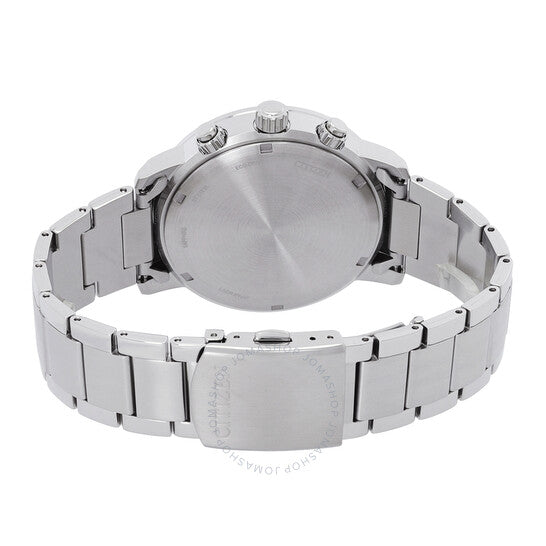 Silver-tone stainless steel case and bracelet. Fixed silver-tone stainless steel bezel. Green dial with silver-tone hands and index hour markers. Minute scale around the inner rim. Dial Type: Analog. Luminescent hands and markers. Date display at the 3 o'clock position. Chronograph - three sub-dials displaying: 60 second, 60 minute and 24 hour. Citizen Caliber B612 quartz movement. Scratch resistant sapphire crystal. Solid case back. Round case shape, case size: 43 mm, case thickness: 11.5 mm. Fold over clasp with a safety release. Water resistant at 100 meters / 330 feet. Functions: chronograph, date, hour, minute, second. Sport watch style. Watch label: Japan Movt. Citizen Chronograph Quartz Green Dial Men's Watch CA0840-87X.