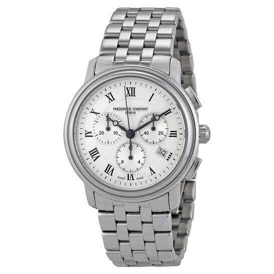 Stainless steel case with a stainless steel bracelet. Fixed stainless steel bezel. Silver guilloche dial with black hands and Roman numeral hour markers. Minute markers around the outer rim. Dial Type: Analog. Date display at the 4 o'clock position. Chronograph - three sub-dials displaying: 60 second, 30 minute and 12 hour. Frederique Constant calibre FC-292 quartz movement. Scratch resistant sapphire crystal. Pull / push crown. Solid case back. Case size: 40 mm. Case thickness: 10.2 mm. Round case shape. Band width: 20 mm. Band length: 8 inches. Deployment clasp. Water resistant at 60 meters / 200 feet. Functions: chronograph, date, hour, minute, second. Casual watch style. Watch label: Swiss Made. Item Variations: FC 292MC4P6B2, FC.292MC4P6B2, FC292MC4P6B2. Frederique Constant Chronograph Silver Dial Men's Watch FC-292MC4P6B2.