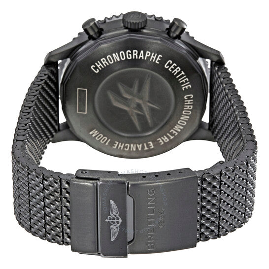 Black stainless steel case and bracelet. Bi-directional rotating black stainless steel bezel with a black ceramic top ring. Black dial with luminous grey hands and index hour markers. Minute markers. 24 hour markers around the outer rim. Dial Type: Analog. Luminescent hands and markers. Date display at the 3 o'clock position. Chronograph - three sub-dials displaying: 60 second, 30 minute and 12 hours. Breitling calibre 24 automatic movement with a 42-hour power reserve. Scratch resistant sapphire crystal. Screw locked crown. Solid case back. Case size: 46 mm. Case thickness: 16 mm. Round case shape. Band width: 24 mm. Fold over clasp with a safety release. Water resistant at 100 meters / 330 feet. Functions: chronograph, date, hour, minute, second, 24 hours. Luxury watch style. Watch label: Swiss Made. Breitling Chronoliner Automatic Chronograph Men's Watch M2431013/BF02SS.