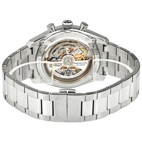 Stainless steel case with a stainless steel bracelet. Fixed stainless steel bezel. Blue sunray (open heart) dial with luminous silver-tone hands and index hour markers. Minute markers. Tachymeter markings around the outer rim. Dial Type: Analog. Luminescent hands and markers. Chronograph - two sub-dials displaying: 12 hour and 30 minute. Zenith calibre El Primero 4061 automatic movement, based upon Zenith El Primero 400, containing 31 Jewels, composed of 282 parts, bitting at 36000 vph, and has a power reserve of approximately 50 hours. Scratch resistant sapphire crystal. Transparent case back. Round case shape. Case size: 42 mm. Band width: 20 mm. Fold over clasp. Water resistant at 100 meters / 330 feet. Functions: chronograph, column wheel, hour, minute, small second. Chronomaster El Primero Series. Luxury watch style. Watch label: Swiss Made. Zenith Chronomaster El Primero Chronograph Automatic Men's Watch 03.20416.4061/51.M2040.