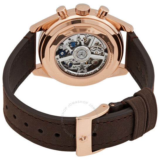 18kt rose gold case with a brown leather strap. Fixed rose gold 18kt rose gold bezel. White dial with rose gold hands and index hour markers. Minute markers around the outer rim. Dial Type: Analog. Luminescent hands and markers. Date display between 4 and 5 o'clock position. Chronograph - three sub-dials displaying: 60 second, 60 minute and 1/10th of a second. Zenith Calibre El Primero 3600 Automatic movement, containing 35 Jewels, composed of 311 parts, bitting at 36000 vph, and has a power reserve of approximately 60 hours. Scratch resistant sapphire crystal. Transparent see through case back. Round case shape, case size: 38 mm. Folding clasp. Water resistant at 50 meters / 165 feet. Functions: chronograph, date, hour, minute, second. Chronomaster El Primero Series. Luxury watch style. Watch label: Swiss Made. Zenith Chronomaster El Primero Chronograph Automatic White Dial Men's Watch 18.3200.3600/69.C901.
