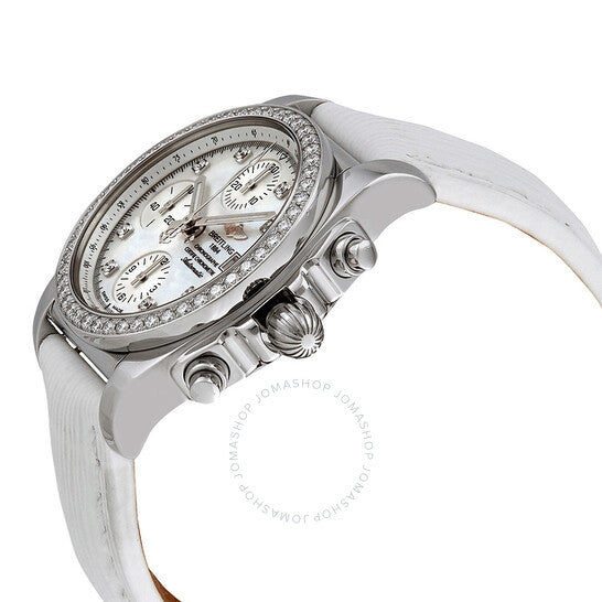 Stainless steel case with a white (Sahara) leather strap. Fixed stainless steel set with diamonds bezel. Mother of pearl dial with luminous silver-tone hands and diamond hour markers. Minute markers. Tachymeter marking around the outer rim. Dial Type: Analog. Luminescent hands. Date display at the 3 o'clock position. Chronograph - three sub-dials displaying: 60 second, 30 minute and 12 hours. Breitling calibre 13 automatic movement with a 42-hour power reserve. Scratch resistant sapphire crystal. Screw locked crown. Solid case back. Round case shape. Case size: 38 mm. Case thickness: 14.80 mm. Band width: 20 mm. Tang clasp. Water resistant at 100 meters / 330 feet. Functions: chronograph, tachymeter, date, hour, minute, second. Luxury watch style. Watch label: Swiss Made. Breitling Chronomat 38 Chronograph Automatic Diamond Ladies Watch A1331053-A776-237XS.