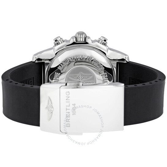 Silver-tone stainless steel case with a blue diver pro rubber strap. Uni-directional rotating silver-tone stainless steel bezel. Blue dial with luminous hands and index hour markers. Tachymeter scale appears around the outer rim. Dial Type: Analog. Luminescent hands and markers. Date display between 4 and 5 o'clock position. Chronograph - three sub-dials displaying: 60 second, 30 minute and 12 hour. Breitling Calibre 01 Automatic movement, containing 47 Jewels, composed of 346 parts, bitting at 28800 vph, and has a power reserve of approximately 70 hours. Scratch resistant sapphire crystal. Screw-locked, two gaskets crown. Solid case back. Round case shape, case size: 41 mm, case thickness: 15.4 mm. Band width: 20 mm. Deployment clasp. Water resistant at 300 meters / 1000 feet. Functions: chronograph, chronometer, date, hour, minute, second, tachymeter. Chronomat 41 Series. Luxury watch style. Watch label: Swiss Made. Item Variations: AB014012 C830BKPD, AB014012.C830BKPD, AB014012C830BKPD. Breitling Chronomat 41 Blue Dial Automatic Men's Watch AB014012-C830BKPD.