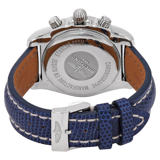 Silver-tone stainless steel case with a blue lizard leather strap. Uni-directional rotating silver-tone stainless steel bezel. White dial with silver-tone hands and index hour markers. Tachymeter. Dial Type: Analog. Luminescent hands and markers. Date display between 4 and 5 o'clock position. Chronograph - three sub-dials displaying: 60 second, 30 minute and 12 hours. Breitling Calibre 01 Automatic movement, containing 47 Jewels, composed of 346 parts, bitting at 28800 vph, and has a power reserve of approximately 70 hours. Scratch resistant sapphire crystal. Screw down crown. Solid case back. Round case shape, case size: 41 mm. Tang clasp. Water resistant at 300 meters / 1000 feet. Functions: chronograph, date, hour, minute, second. Chronomat 41 Series. Luxury watch style. Watch label: Swiss Made. Breitling Chronomat 41 Chronograph Automatic White Dial Men's Watch AB014012/G711.143Z.A18BA.1.