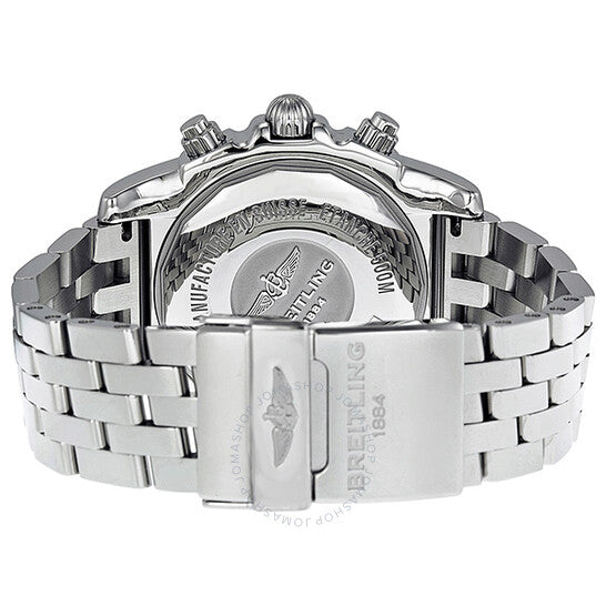 Stainless steel case with a stainless steel bracelet. Uni-directional rotating bezel. Blue dial with silver-tone hands and Roman numeral hour markers. Minute markers around the outer rim. Dial Type: Analog. Luminescent hands and markers. Date display appears between the 4 and 5 o'clock positions. Chronograph - three sub-dials displaying: 60 second, 30 minute and 12 hour. Self winding automatic movement. Scratch resistant sapphire crystal. Screw down crown. Solid case back. Case diameter: 44 mm. Case thickness: 17 mm. Round case shape. Band width: 22 mm. Fold over clasp with safety. Water resistant at 500 meters / 1650 feet. Functions: chronograph, date, hour, minute, second. Luxury watch style. Watch label: Swiss Made. Breitling Chronomat 44 Automatic Chronograph Blue Dial Men's Watch AB011012-C783SS.