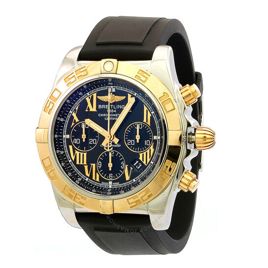 Stainless steel and 18k rose gold case with a black rubber strap. Uni-directional rotating 18k rose gold bezel. Black dial with rose gold-tone hands and Roman numeral hour markers. Tachymeter scale. Dial Type: Analog. Luminescent hands and markers. Date display between 4 and 5 o'clock position. Chronograph - three sub-dials displaying: 60 second, 30 minute and 12 hours. Breitling Calibre 01 Automatic movement, containing 47 Jewels, composed of 346 parts, bitting at 28800 vph, and has a power reserve of approximately 70 hours. Scratch resistant sapphire crystal. Screw down crown. Round case shape, case size: 44 mm. Tang clasp. Water resistant at 500 meters / 1650 feet. Functions: chronograph, date, hour, minute, second. Chronomat 44 Series. Dive watch style. Watch label: Swiss Made. Breitling Chronomat 44 Chronograph Automatic Black Dial Men's Watch CB011012/B957.131S.A20S.1.