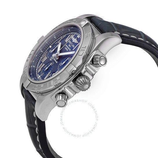Silver-tone stainless steel case with a blue crocodile leather strap. Uni-directional rotating silver-tone stainless steel bezel. Blue dial with silver-tone hands and Roman numeral hour markers. Minute markers around the outer rim. Dial Type: Analog. Luminescent hands and markers. Date display between 4 and 5 o'clock position. Breitling Calibre 01 Automatic movement, containing 47 Jewels, composed of 346 parts, bitting at 28800 vph, and has a power reserve of approximately 70 hours. Scratch resistant sapphire crystal. Screw down crown. Solid case back. Round case shape, case size: 44 mm, case thickness: 16.95 mm. Tang clasp. Water resistant at 500 meters / 1650 feet. Functions: chronograph, date, hour, minute, second. Chronomat 44 Series. Dive watch style. Watch label: Swiss Made. Breitling Chronomat 44 Chronograph Automatic Blue Dial Men's Watch AB011011/C783.731P.A20BA.1.