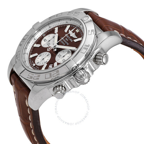 Silver-tone polished stainless steel case with a brown crocodile leather strap. Uni-directional rotating bezel. Brown dial with silver-tone hands and index hour markers. Tachymeter. Dial Type: Analog. Luminescent hands and markers. Date display between 4 and 5 o'clock position. Chronograph - three sub-dials displaying: 60 second, 30 minute and 12 hours. Automatic movement. Scratch resistant sapphire crystal. Screw down crown. Round case shape, case size: 44 mm. Tang clasp. Water resistant at 500 meters / 1650 feet. Functions: chronograph, date, hour, minute, second. Chronomat 44 Series. Dive watch style. Watch label: Swiss Made. Breitling Chronomat 44 Chronograph Automatic Brown Dial Men's Watch AB011012/Q575.739P.A20BA.1.