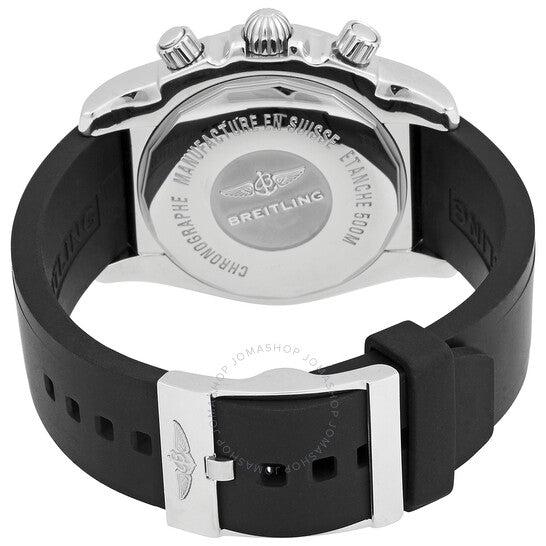 Silver-tone stainless steel case with a black rubber strap. Uni-directional rotating polished stainless steel bezel. Blackeye blue dial with silver-tone hands and index hour markers. Tachymeter. Dial Type: Analog. Luminescent hands and markers. Date display between 4 and 5 o'clock position. Breitling Calibre 01 Automatic movement, containing 47 Jewels, composed of 346 parts, bitting at 28800 vph, and has a power reserve of approximately 70 hours. Scratch resistant sapphire crystal. Screw down crown. Solid case back. Round case shape, case size: 43.5 mm. Tang clasp. Water resistant at 500 meters / 1650 feet. Functions: chronograph, date, hour, minute, second. Chronomat 44 Series. Dive watch style. Watch label: Swiss Made. Breitling Chronomat 44 Chronograph Automatic Men's Watch AB011012/C789.131S.A20S.1.
