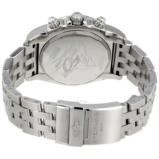 Stainless steel case with a stainless steel bracelet. Bi-directional rotating stainless steel bezel. Black dial with silver-tone hands and index hour markers. Minute markers. 24 hour markers. tachymeter markings around the outer rim. Dial Type: Analog. Luminescent hands and markers. Date display between the 4 and 5 o'clock positions. Chronograph - three sub-dials displaying: 60 second, 30 minute and 12 hour. Breitling Calibre 04 automatic movement with about 70 hours of power reserve. Scratch resistant sapphire crystal. Screw down crown. Solid case back. Case size: 44 mm. Case thickness: 16.95 mm. Round case shape. Band width: 22 mm / 20 mm. Deployment clasp. Water resistant at 200 meters / 660 feet. Functions: GMT, date, second time zone, hour, minute, second. Additional Info: limited edition of 1000 pcs. Luxury watch style. Watch label: Swiss Made. Breitling Chronomat 44 GMT Black Dial Men's Watch AB04203J/BD29SS.
