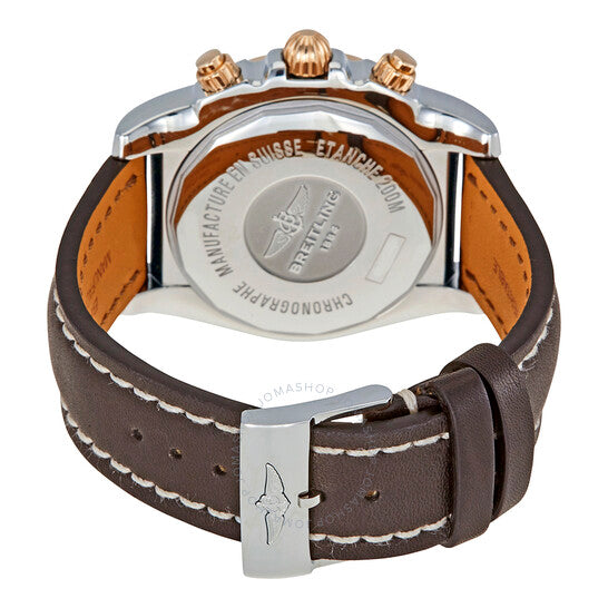 Stainless steel case with a black leather strap. Bi-directional rotating 18kt rose gold bezel. Black dial with luminous rose gold-tone hands and index hour markers. Minute markers. 24 hour markers. Tachymeter markings around the outer rim. Dial Type: Analog. Luminescent hands and markers. Date display between 4 and 5 o'clock position. Chronograph - three gold sub-dials displaying: 60 second, 30 minute and 12 hour. Breitling calibre 04 automatic movement with a 70-hour power reserve. Scratch resistant sapphire crystal. Screw locked crown. Solid case back. Case size: 44 mm. Case thickness: 16.90 mm. Round case shape. Band width: 22 mm / 20 mm. Tang clasp. Water resistant at 200 meters / 660 feet. Functions: date, GMT, second time zone, hour, minute, second, tachymeter,. Luxury watch style. Watch label: Swiss Made. Breitling Chronomat 44 GMT Black Dial Men's Watch CB042012/BB86BKLT.