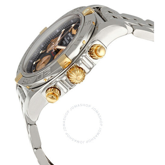 Stainless steel case with a stainless steel bracelet. Unidirectional stainless steel bezel with gold accents. Black dial with gold-tone hands and index hour markers. Minute markers. 1/100 markers. Tachymeter scale appears around the outer rim. Dial Type: Analog. Luminescent hands and markers. Date display appears at the 3 o'clock position. Chronograph - three sub-dials displaying: 60 second, 60 minute and 12 hour. Self winding movement. Scratch resistant sapphire crystal. Screw locked crown. Solid case back. Case diameter: 43.50 mm. Case thickness: 17 mm. Round case shape. Deployment clasp. Water resistant at 500 meters/ 1650 feet. Functions: hours, minutes, seconds, calendar, chronograph, tachymeter. Sport watch style. Watch label: Swiss Made. Breitling Chronomat B01 Black Dial Chronograph Men's Watch IB011012-B968SS.
