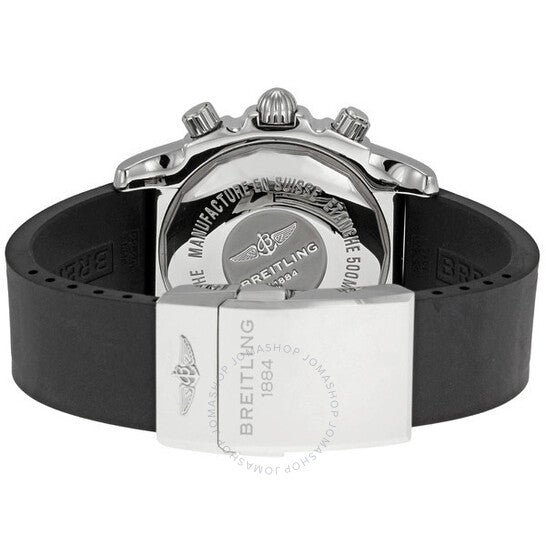 Silver-tone stainless steel case with a black diver pro ii rubber strap. Uni-directional rotating stainless steel bezel with a silver-tone count-up elapsed time top ring. Black dial with luminous hands and index hour markers. Minute markers, tachymeter scale appears around the outer rim. Dial Type: Analog. Luminescent hands and markers. Date display between 4 and 5 o'clock position. Chronograph - three sub-dials displaying: 60 second, 30 minute and 12 hour. Breitling Calibre 01 Automatic movement, containing 47 Jewels, composed of 346 parts, bitting at 28800 vph, and has a power reserve of approximately 70 hours. Scratch resistant sapphire crystal. Screw locked crown. Solid case back. Round case shape, case size: 43.50 mm, case thickness: 17 mm. Band width: 22 mm. Deployment clasp. Water resistant at 500 meters / 1650 feet. Functions: chronograph, chronometer, date, hour, minute, second, tachymeter. Chronomat 01 Series. Dive watch style. Watch label: Swiss made. Item Variations: AB011012-B967-134s-a20d-2 AB011012-B967BKPD. Breitling Chronomat B01 Onyx Dial Chronograph Men's Watch AB011012-B967BKPD.