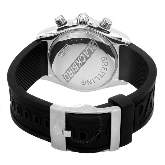 Silver-tone stainless steel case with a black rubber strap. Bi-directional rotating stainless steel bezel. Black dial with silver-tone hands and index hour markers. Dial Type: Analog. Luminescent hands and markers. Date display at the 12 o'clock position. Chronograph - three sub-dials displaying: 60 second, 30 minute and 12 hours. Automatic movement with a 42-hour power reserve. Scratch resistant sapphire crystal. Screw down crown. Round case shape, case size: 43.7 mm. Tang clasp. Water resistant at 300 meters / 1000 feet. Functions: chronograph, date, hour, minute, second. Chronomat Blackbird Big Date Series. Luxury watch style. Watch label: Swiss Made. Breitling Chronomat Blackbird Big Date Chronograph Automatic Men's Watch A4435910/B811.120S.A20SS.