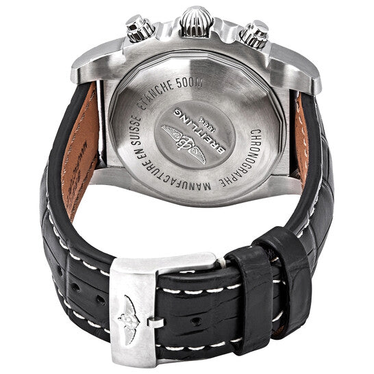 Stainless steel case with a black (alligator) leather strap. Uni-directional rotating stainless steel bezel. Blue dial with luminous silver-tone hands and index hour markers. Minute markers. 1/100th markers. Tachymeter markings around the outer rim. Dial Type: Analog. Luminescent hands and markers. Date display between the 4 and 5 o'clock positions. Chronograph - three sub-dials displaying: 60 second, 30 minute and 12 hour. Breitling calibre 01 automatic movement with a 70-hour power reserve. Scratch resistant sapphire crystal. Screw locked crown. Solid case back. Round case shape. Case size: 44 mm. Case thickness: 16.95 mm. Band width: 22 mm. Tang clasp. Water resistant at 500 meters / 1650 feet. Functions: chronograph, date, hour, minute, second, chronometer. Dive watch style. Watch label: Swiss Made. Item Variations: AB011510-CA01-743P-A20BASA.1. Breitling Chronomat Chronograph Automatic Chronometer Blue Dial Men's Watch AB0115101C1P2.
