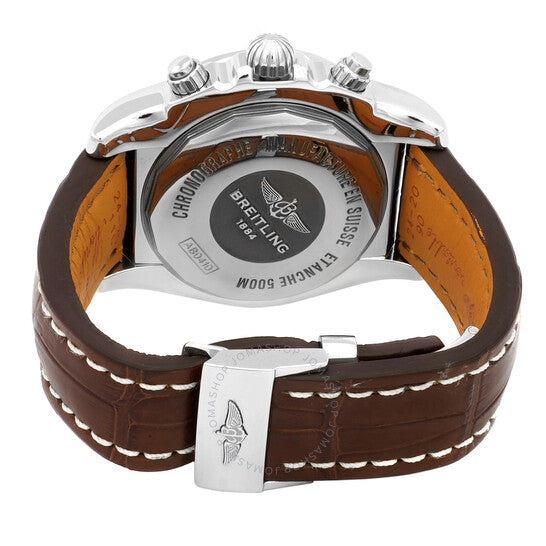 Silver-tone stainless steel case with a brown crocodile leather strap. Bi-directional rotating silver-tone stainless steel bezel. Sierra silver dial with silver-tone hands and index hour markers. Tachymeter scale around the outer rim. Dial Type: Analog. Luminescent hands and markers. Date display between 4 and 5 o'clock position. Chronograph - three sub-dials displaying: 60 second, 30 minute and 12 hour. Breitling Calibre 04 Automatic movement, based upon Breitling Calibre 01, containing 47 Jewels, bitting at 28000 vph, and has a power reserve of approximately 70 hours. Scratch resistant sapphire crystal. Screw down crown. Solid case back. Round case shape, case size: 47 mm. Deployment with push button release clasp. Water resistant at 500 meters / 1650 feet. Functions: chronograph, date, hour, minute, second, GMT, second time zone, chronometer. Chronomat Gmt Series. Luxury watch style. Watch label: Swiss Made. Breitling Chronomat GMT Chronograph Automatic Chronometer Men's Watch AB041012/G719.757P.A20D.1.