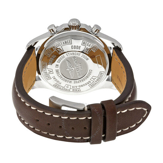 Stainless steel case with a brown leather strap. Bi-directional rotating stainless steel bezel. Silver dial with luminous silver-tone hands and index hour markers. An Arabic numeral appears at the 12 o'clock position. Minute markers. Slide rule markings around the outer rim. Dial Type: Analog. Luminescent hands and markers. Date display between 4 and 5 o'clock positions. Chronograph - three black sub-dials displaying: 60 second, 30 minute and 12 hour. Automatic movement with a 42-hour power reserve. Scratch resistant sapphire crystal. Screw locked crown. Solid case back. Case diameter: 46 mm. Case thickness: 16 mm. Round case shape. Band width: 24 mm. Band length: 8 inches. Tang clasp. Water resistant at 200 meters / 660 feet. Functions: chronograph, date, hour, minute, second. Luxury watch style. Watch label: Swiss Made. Breitling Chronospace Automatic Silver Dial Brown Leather Men's Watch A2336035-G718BRLT.