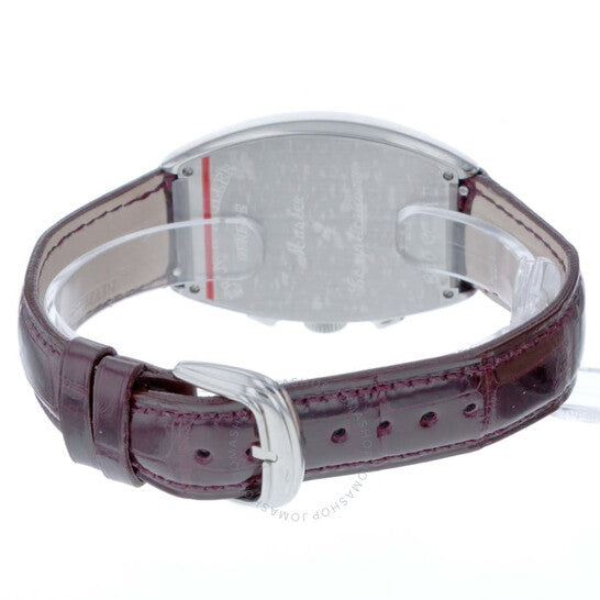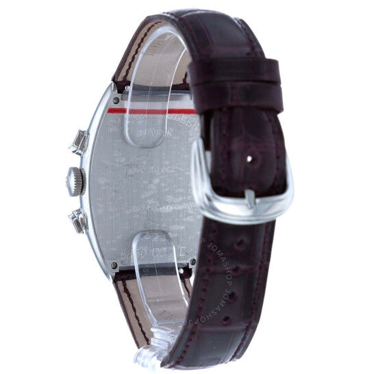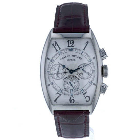 Silver-tone stainless steel case with a genuine leather strap. Fixed silver-tone stainless steel bezel. Silver-tone dial with blue hands and Arabic numeral hour markers. Minute markers around the outer rim. Dial Type: Analog. Date display at the 6 o'clock position. Chronograph - three sub-dials displaying: 60 second, 30 minute and 12 hour. Automatic movement. Scratch resistant sapphire crystal. Solid case back. Tonneau case shape, case size: 36 mm. Buckle clasp. Functions: hour, minute, second, date, chronograph. Cintree Curvex Series. Luxury watch style. Watch label: Swiss Made. Franck Muller Cintree Curvex Chronograph Automatic Silver Dial Men's Watch 6850 CC AT.