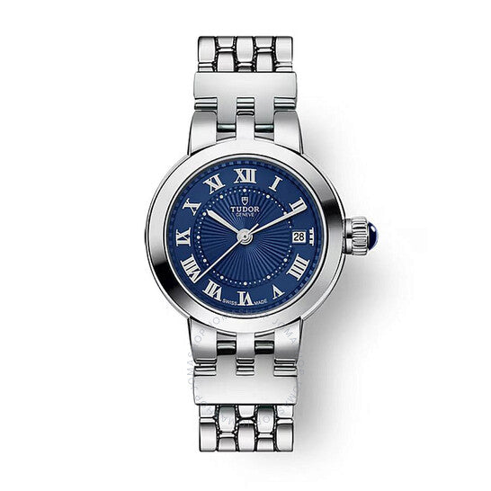 Silver-tone stainless steel case and bracelet. Fixed silver-tone stainless steel bezel. Blue dial with silver-tone hands and Roman numeral hour markers. Dial Type: Analog. Date display at the 3 o'clock position. Tudor Calibre T201 Automatic movement, based upon ETA 2671, containing 25 Jewels, bitting at 28800 vph, and has a power reserve of approximately 38 hours. Scratch resistant sapphire crystal. Screw down crown. Solid case back. Round case shape, case size: 26 mm, case thickness: 10.3 mm. Band width: 7 mm. Folding clasp. Water resistant at 100 meters / 330 feet. Functions: date, hour, minute, second. Clair De Rose Series. Dress watch style. Watch label: Swiss Made. Tudor Clair de Rose Automatic Blue Dial Ladies Watch M35200-0009.