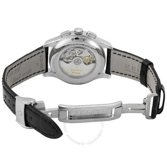 Silver-tone stainless steel case with a black leather strap. Fixed silver-tone stainless steel bezel. Black dial with luminous silver-tone hands and alternating hour index and Arabic numeral, minute markers around the outer rim hour markers. Dial Type: Analog. Luminescent hands and markers. Four sub-dials displaying: 30 minute counter at the 3 o'clock position, power reserve indicator at the 6 o'clock position, opened dial at 10 o'clock showing the heart of el primero movement, small second hand at 9 o'clock. Zenith Calibre El Primero 4021H ( 248 components, 36,000 vph, 39 jewels) automatic movement with a 50-hour power reserve. Scratch resistant sapphire crystal. Screw down crown. Transparent exhibition case back case back. Round case shape, case size: 42.5 mm, case thickness: 10.0 mm. Tang clasp. Water resistant at 50 meters / 165 feet. Functions: chronograph, hour, minute, second, power reserve indicator. Additional Info: chronograph, power reserve indicator. Class Open El Primero Series. Sport watch style. Watch label: Swiss Made. Item Variations: 03.0510.4021-21.C492, 03 0510 4021 21 C492, 030510402121C492. Zenith Class Open El Primero Chronograph Men's Watch 03.0510.4021.21.C492.