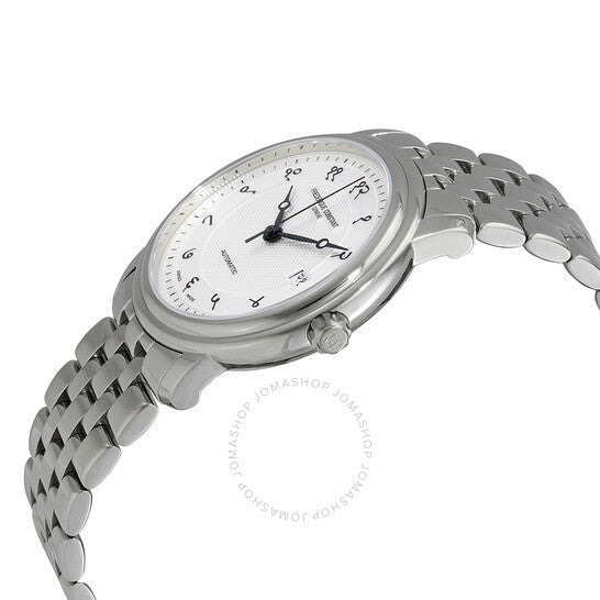 Silver-tone stainless steel case with a silver-tone stainless steel bracelet. Fixed silver-tone stainless steel bezel. Silver dial with black Breguet-style shape hands and indian sanskrit numeral hour markers. Minute markers around the outer rim. Dial Type: Analog. Date display at the 3 o'clock position. Frederique Constant Calibre FC-303 Automatic movement, based upon Sellita SW200-1, containing 26 Jewels, bitting at 28800 vph, and has a power reserve of approximately 38 hours. Scratch resistant sapphire crystal. Pull / push crown. Transparent case back. Round case shape, case size: 43 mm, case thickness: 7.7 mm. Band width: 22 mm. Butterfly clasp. Water resistant at 60 meters / 200 feet. Functions: date, hour, minute, second. Dress watch style. Watch label: Swiss Made. Item Variations: FC 303IC4P6B, FC.303IC4P6B, FC303IC4P6B. Frederique Constant Classic Automatic Silver Dial Men's Watch FC-303IC4P6B.