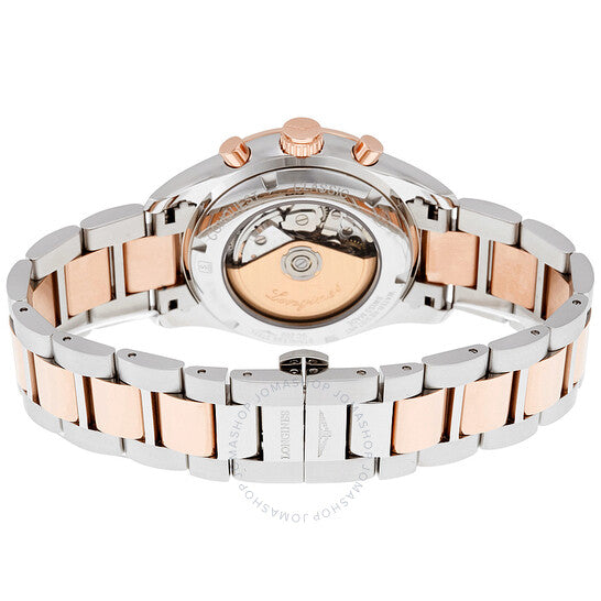 Stainless steel case with a stainless steel bracelet with 18kt rose gold center links. Fixed 18kt rose gold bezel. Silver dial with luminous rose gold-tone hands and index hour markers. Date scale minute markers around the outer rim. Dial Type: Analog. Luminescent hands and markers. Day of the week and month display below the 12 o'clock position. Chronograph - three sub-dials displaying: dual 60 second / 24 hour, 30 minute and 12 hour / moonphase. Longines calibre 678 automatic movement with a 46-hour power reserve. Scratch resistant sapphire crystal. Pull / push crown. Transparent case back. Case size: 42 mm. Case thickness: 14.5 mm. Round case shape. Band width: 21 mm. Fold over clasp with safety release. Water resistant at 50 meters / 165 feet. Functions: chronograph, date, day, month, moonphase, hour, minute, second. Casual watch style. Longines Classic Conquest Chronograph Silver Dial Men's Watch L27985727.